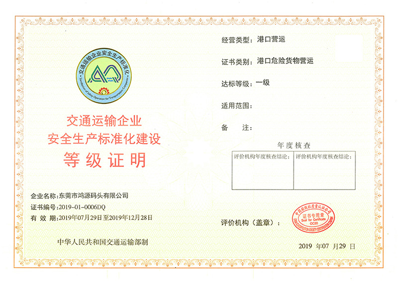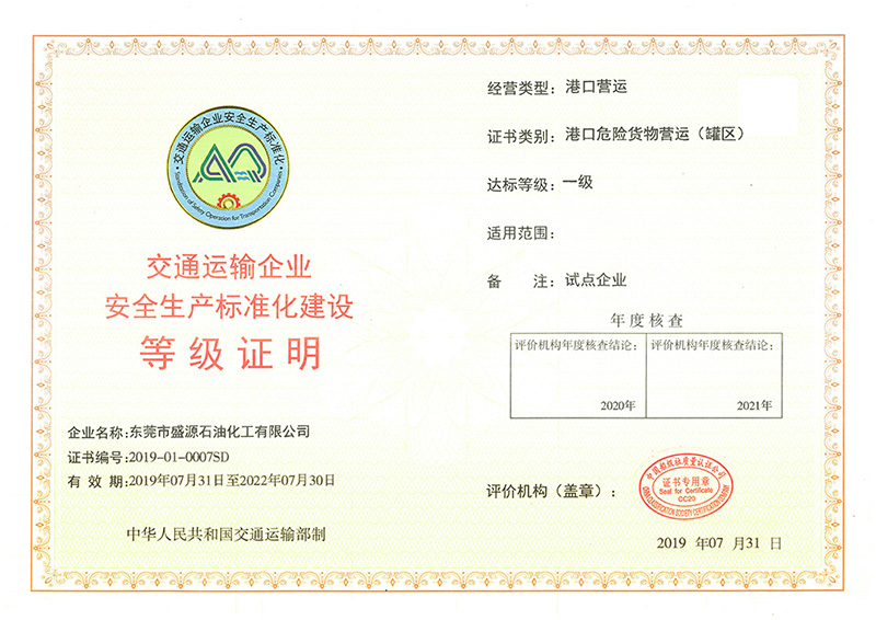 日前,巨正源所屬盛源石化、鴻源碼頭正式獲得由國家交通運輸部頒發(fā)的“交通運輸企業(yè)安全生產標準化建設一級達標企業(yè)證書”,這標志著盛源石化、鴻源碼頭安全生產管理邁上標準化、規(guī)范化的新臺階。